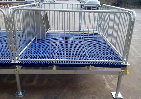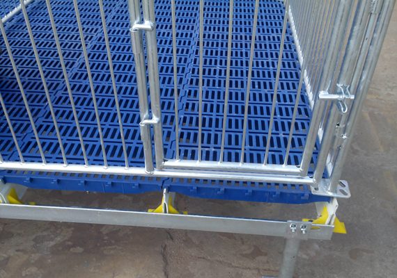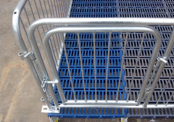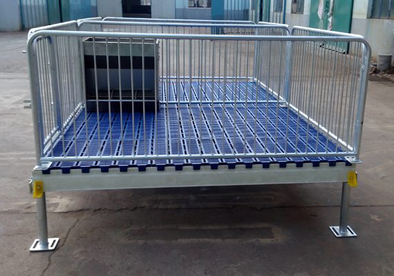 Piglet nursery stall is a professional equipment for taking care of the piglets which are 35 days old and already weaned. The floor adopts plastic manure dropping board, the faeces can drop through the gaps of the floor. So it can prevent the environmental pollution and disease, and improve the survival rate efficiently. The thermal insulation properties is very well, and the texture is soft and firm. It will not hurt the piglet’s feet. The piglet size is rational which can meet the whole brood of piglets need. The whole stall is very easy to install and no need to be welded. The frame of the rails are made of hot galvanized pipes, which combined with PVC boards. The thickness of the pipe is 2.5mm, and the welds are firm and nice. The two-sided trough and round automatic feeders are all optional.